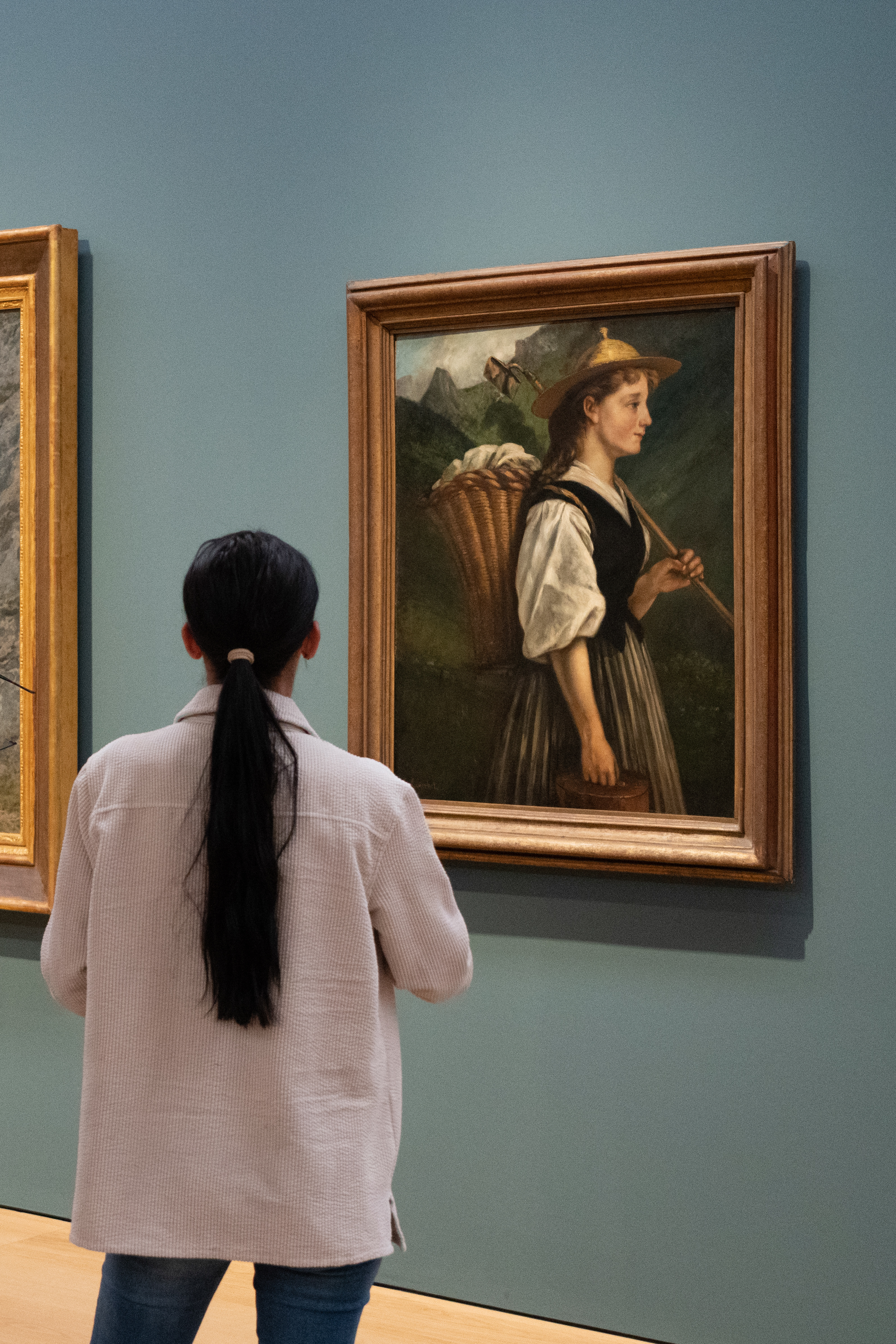 Namgyal commente en tibétain « Taureau dans les Alpes » d’Eugène Burnand (1884). Les paysages alpins suisses du tableau lui évoquent les sommets du Tibet. Le taureau, quant à lui, la renvoie aux yaks et aux dis (femelles). Chaque matin, ces animaux sont emmenés en haut des montagnes. Elle explique la relation à ces bêtes, ainsi que les nombreux usages des denrées qu’elles permettent de produire.
