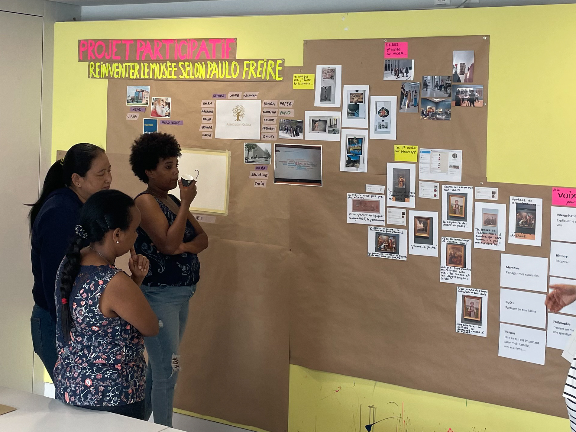 Un autre élément inspiré de Freire s’est inscrit dans la valorisation et la conservation de traces verbales, témoignant tant du développement du projet que des progrès en langue étrangère française. En effet, l’outil de visualisation présenté plus haut, le « journal mural » (inspiré des dispositifs visuels utilisés par Paulo Freire) est venu soutenir l’organisation de la collaboration. Ce mur présentait initialement dans l’espace de travail au musée les actrices de la rencontre, les médiatrices, le groupe et la chercheuse. Y figurait également une présentation de Freire, dont le travail et le parcours ont été évoqués. Dans un second temps, un outil similaire s’est développé dans les locaux de l’association. Ce dialogue différé dans l’espace et le temps avait pour visée une autonomie du groupe dans une phase de réflexion et de conception de l’objet culturel à venir.
